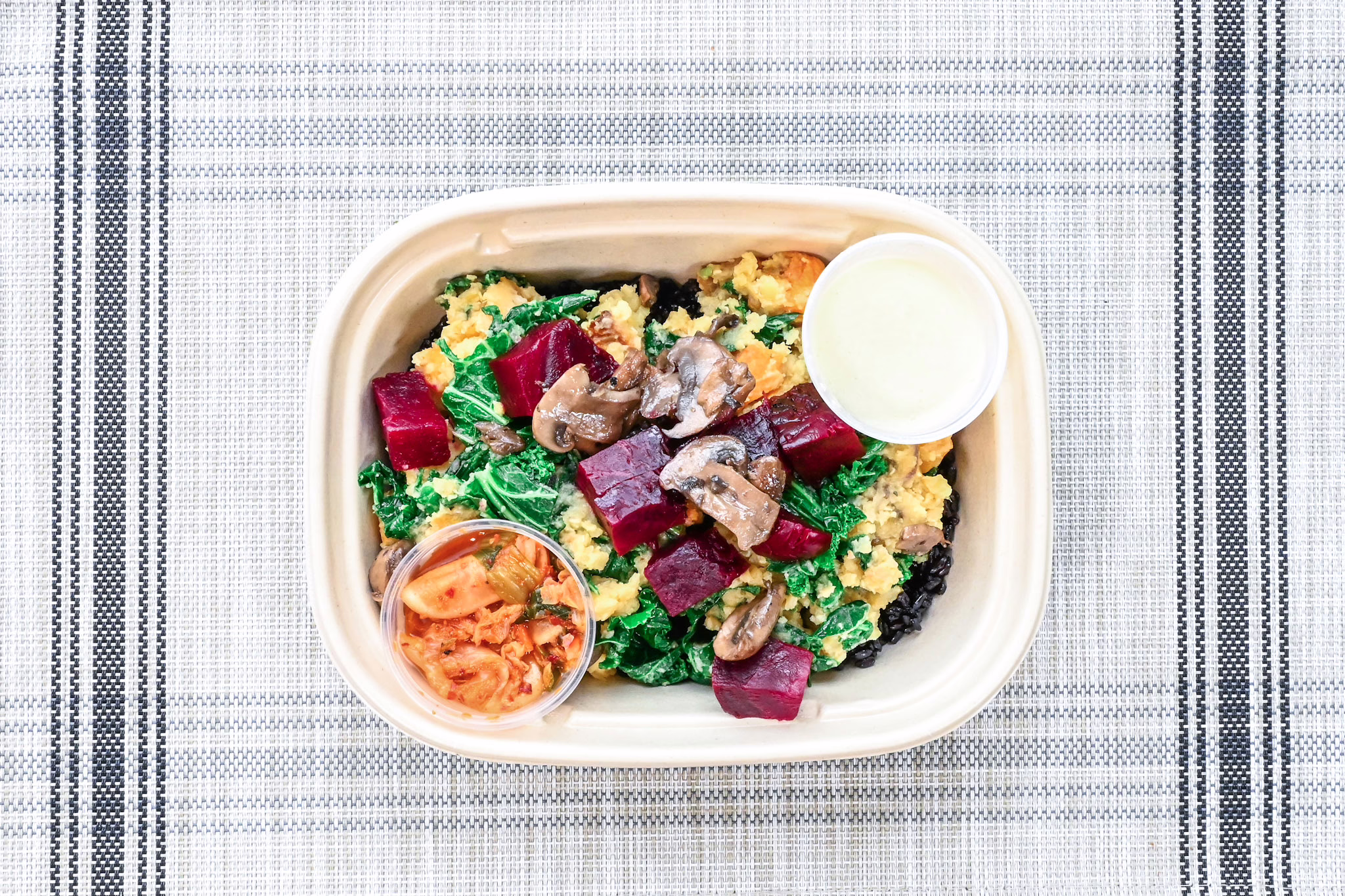 Red lentils, kale, butternut squash, beets, crimini mushrooms and red onion in apple cider vinaigrette over black rice topped with pepitas and a side of our kimchi