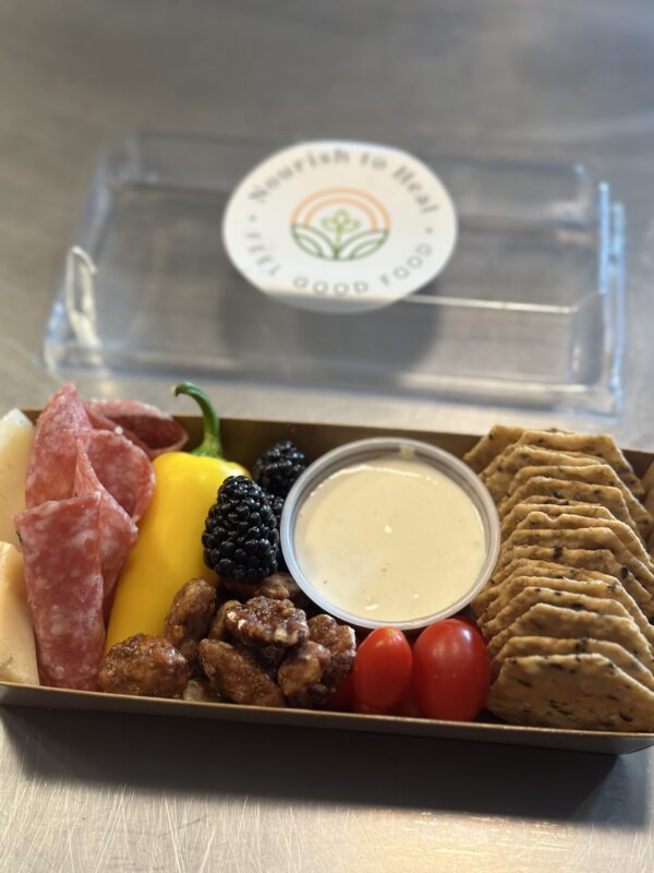 A perfect box for one with assorted crackers, cheese, nuts, meats, veggies, fruit, and dips. We will have vegan and omnivore options available. As always, gluten free and using a fresh assortment of little bites to enjoy on the go, a picnic, or wine bar.