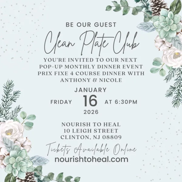 We are super excited to offer this 4 course dinner at Nourish to Heal open to the public. A Clean Plate Kitchen experience at Nourish to Heal with Anthony & Nicole.