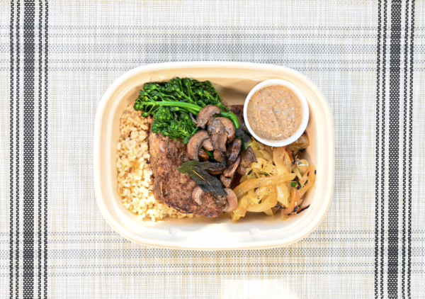 Grassfed beef and free range turkey meatloaf with sage, mushrooms, and caramelized onions with garlicky broccoli and brown rice served with truffled mushroom gravy