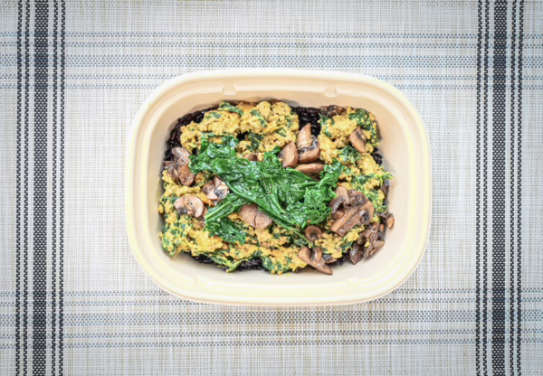 Seasoned, grass-fed local beef with garlic, butternut squash, kale, crimini mushrooms, and onions in a coconut curry sauce over black rice. Extra sauce on the side.