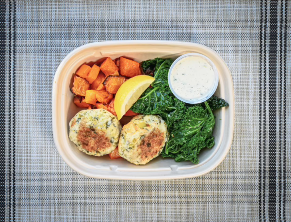 Wild caught cod and leek fish cakes with vegan tartar sauce and served with garlicky kale and roasted butternut squash