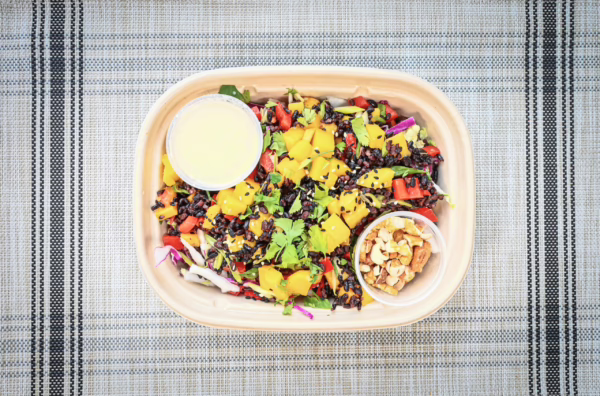 Forbidden Black Rice, Mango, Bok Choy, Red Peppers, Green Onion, Red Cabbage, Cilantro, Sesame Seeds,  Curried Cashews (on the side) and Coconut-Lime Dressing (on the side)