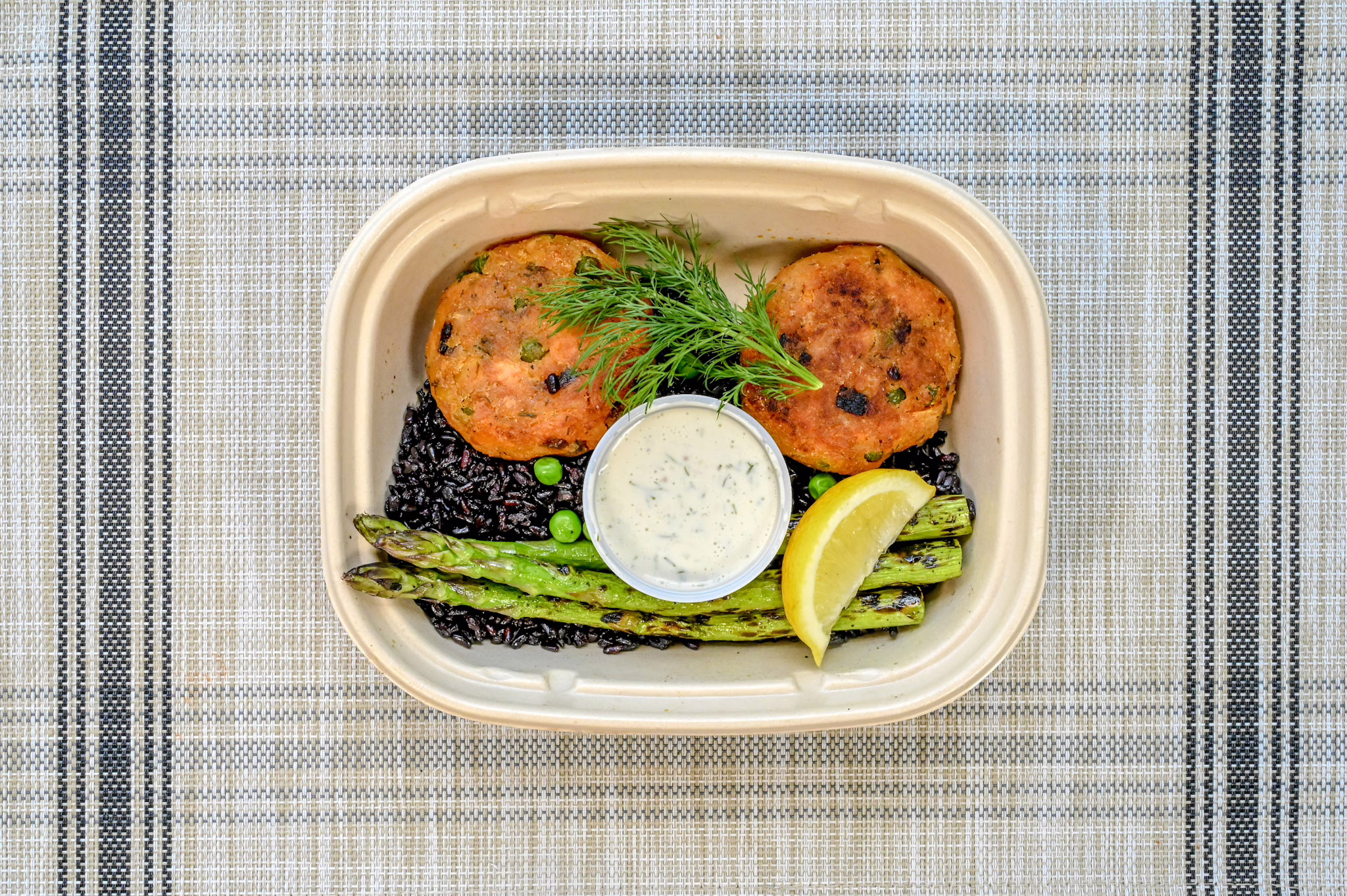 Sustainable salmon, peas and sweet potato cakes with a hint of chipotle,  served with grilled asparagus, peas and black rice. Garnished with lemon wedge and cup of vegan tartar sauce. Choose a single serving or a deconstructed family size with market sides of each component.