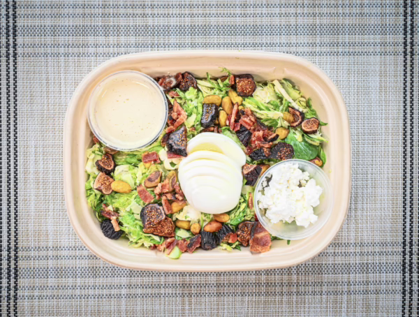 Goat cheese, dried figs, dried cranberries, shaved Brussels sprouts, nitrate-free bacon and pistachios, with apple cider vinaigrette and hard boiled free range egg