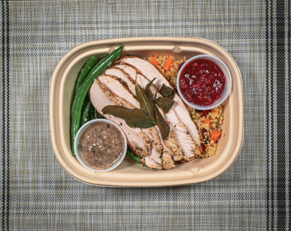 Local, free-range turkey, with mushroom gravy (on the side), cranberry-orange chutney (on the side), served with butternut-quinoa stuffing, and green beans