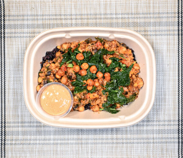 Vegan chickpea and black bean chili with fire roasted red pepper and chunky tomato base with butternut squash, quinoa and lacinato kale served with tofu chipotle cream (on the side)
