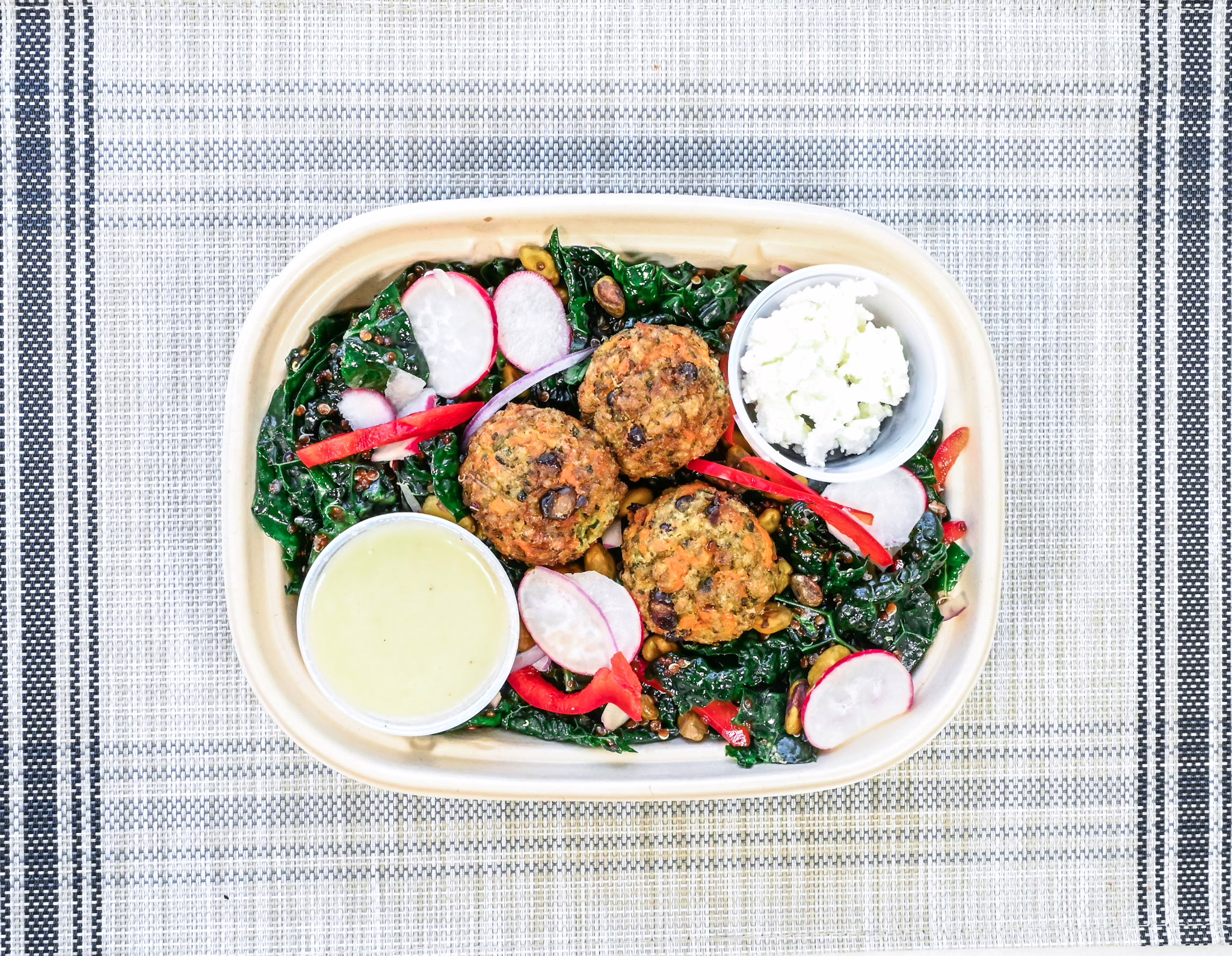 Lacinato kale, radicchio, red quinoa, red onions, peppers, cranberries, pistachios and goat cheese (on the side) tossed in apple cider vinaigrette with extra dressing on the side topped with 3 Vegetable Bean Bites