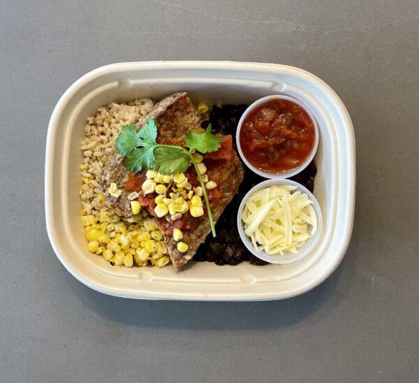 Taco inspired grassfed beef and free range turkey breast meatloaf with peppers, onions, grilled corn, and salsa topped with shredded cheddar cheese (on the side) and served with brown rice & black beans
