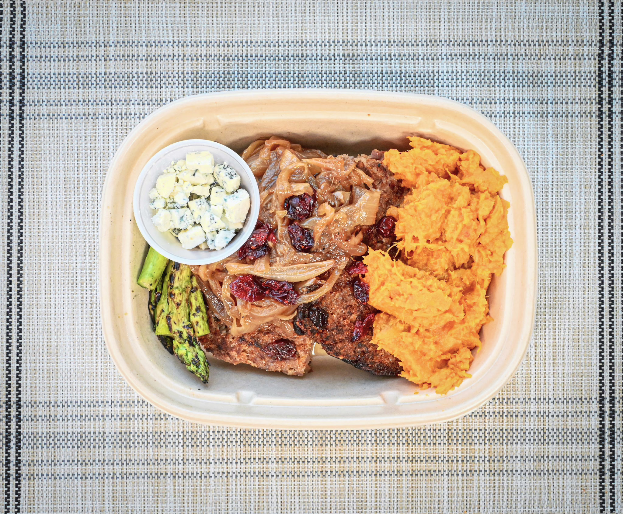 Ground turkey breast and grass-fed beef cranberry meatloaf topped with caramelized onions and blue cheese, served with mashed jewel yams and grilled asparagus.