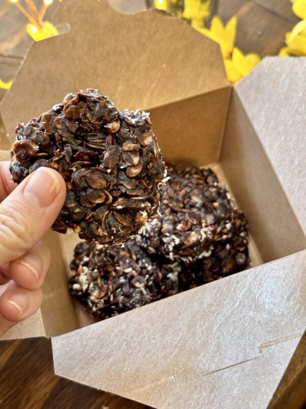 Made with cinnamon, dried cranberries, white chocolate chips, coconut sugar, oats, coconut oil, sunbutter, and vanilla