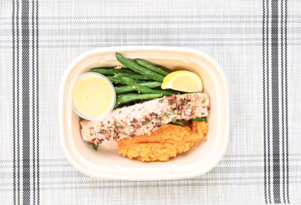 Maple Pecan Crusted Sustainable Scottish Salmon with mashed jewel yams and French green beans with maple mustard glaze on the side