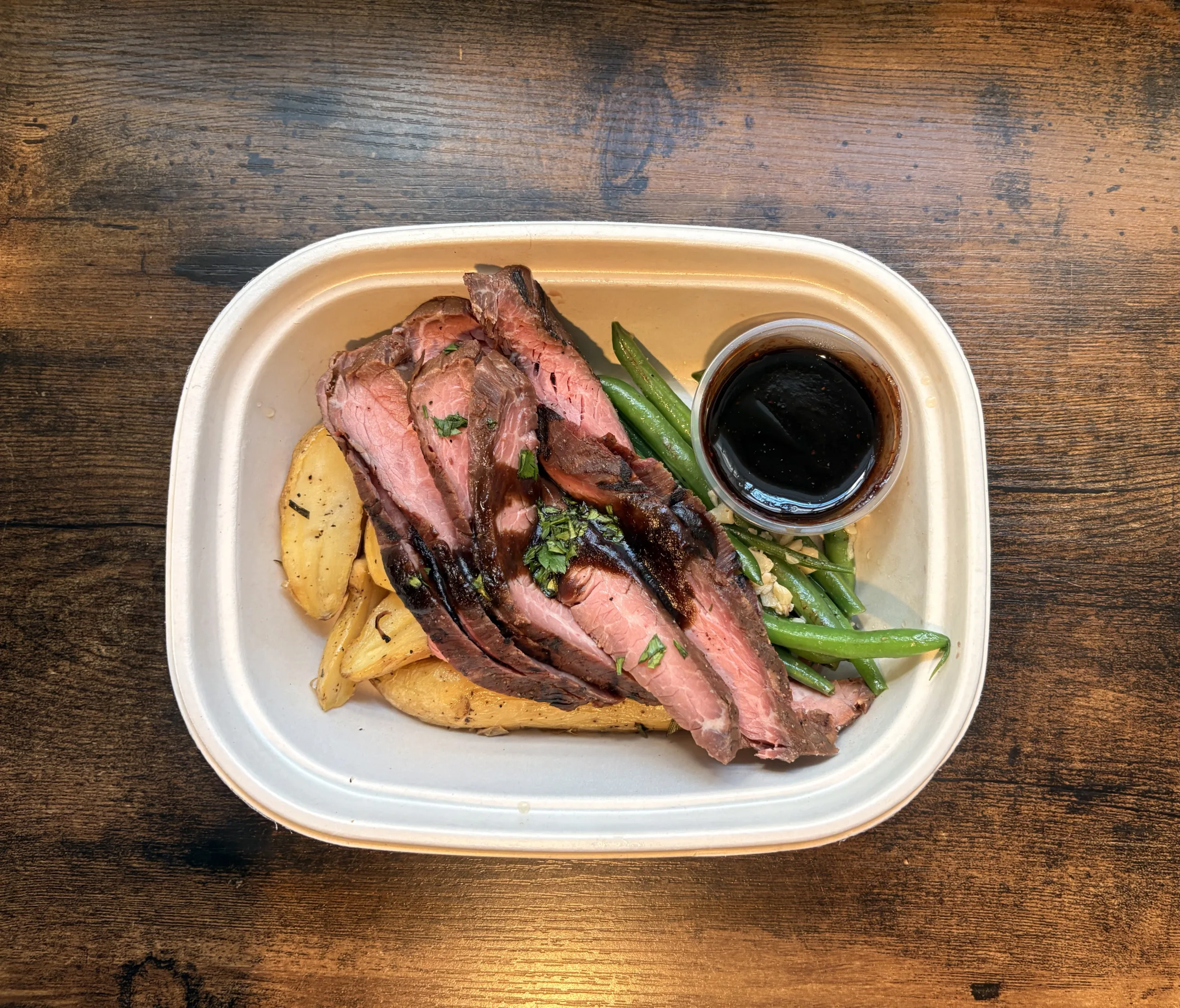 Grilled cranberry balsamic marinated grassfed flank steak with garlicky green beans and rosemary roasted fingerling potatoes.