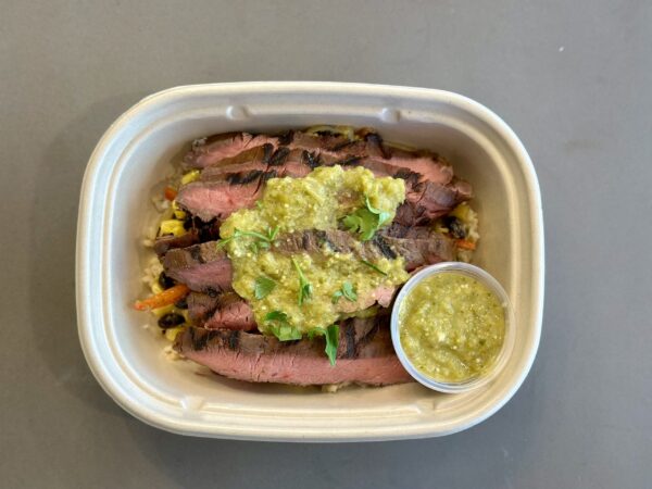 Marinated grass-fed flank steak with peppers, onions, black beans, sprouted brown rice and extra salsa verde on the side.