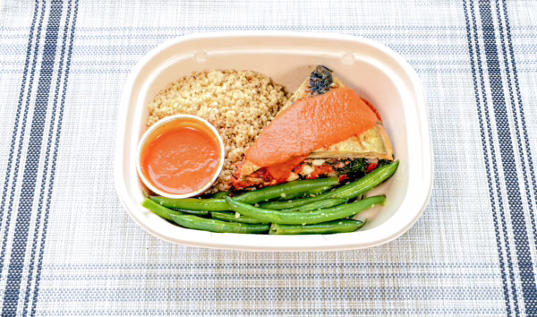 A fan favorite…our veggie pie! Sautéed eggplant veggie pie, red peppers, mushrooms, spinach and tomatoes with feta cheese and fresh herbs topped with red pepper coulis and served with quinoa