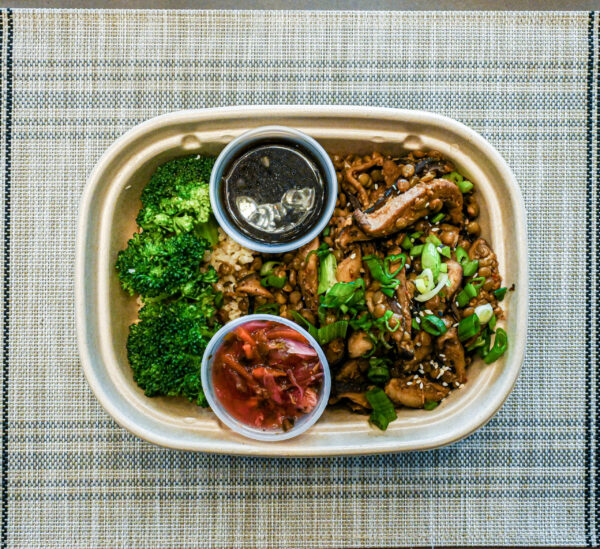 Korean Lentils with ginger, coconut amino, shiitake mushrooms, and sesame oil served with roasted broccoli, over sprouted brown rice topped with sesame seeds and green onions with a side of kimchi