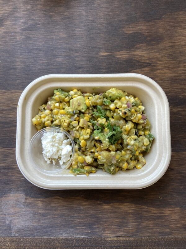Enjoy as a dip, in a wrap, over a salad, or straight. This dish is made with fresh grilled corn, fire roasted shishito peppers, tomatillos, avocado, red onion, cumin cilantro vinaigrette, & toasted pepitas, with feta cheese on the side – you will keep coming back for more!