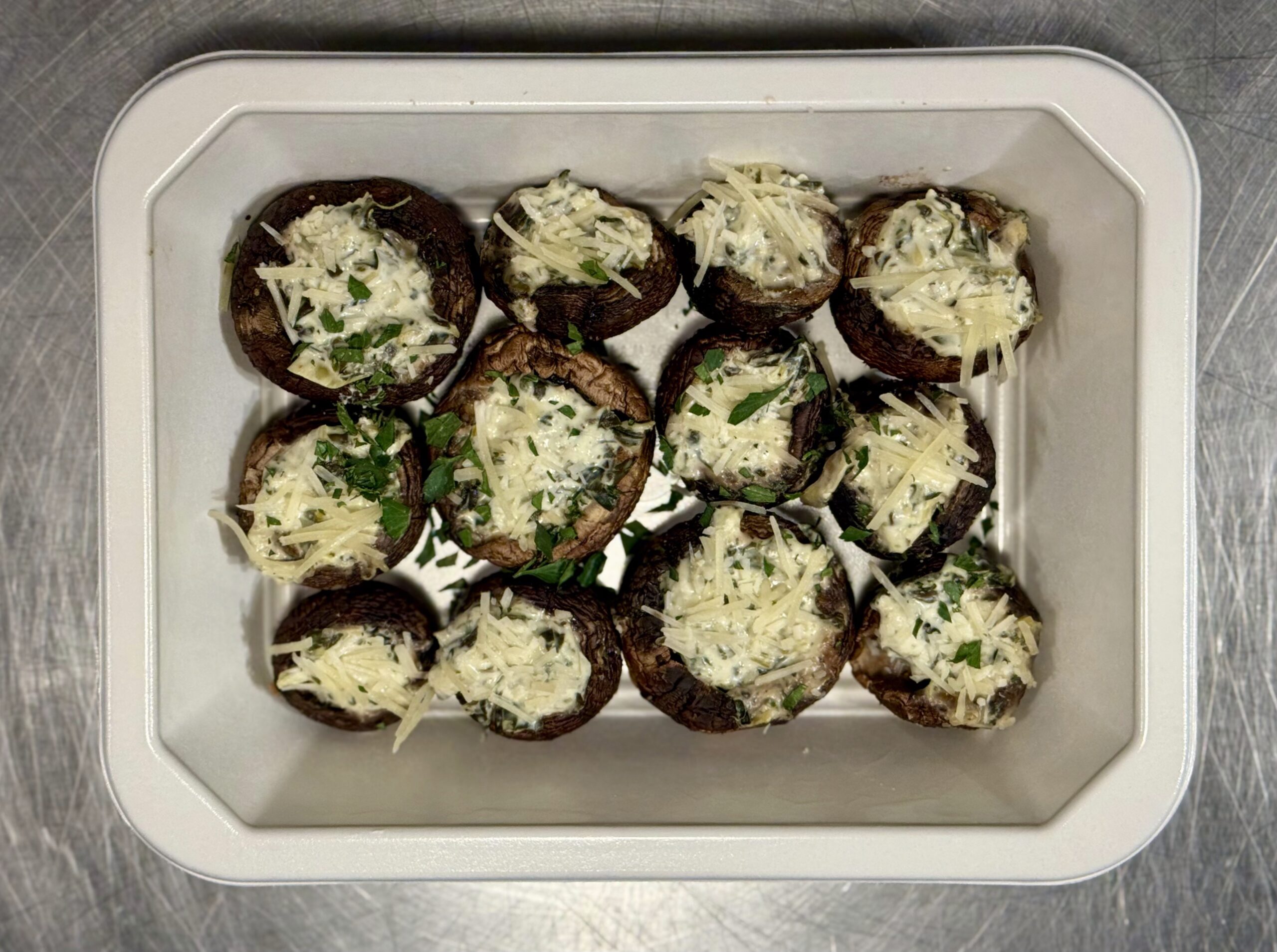 Spinach artichoke stuffed baby bella mushrooms topped with parmesan and pecorino romano cheese