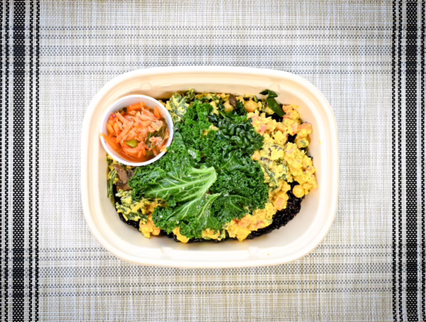 Coconut curry chickpea sauté with garlic, onions, red peppers, carrots, kale and raisins, and quinoa over forbidden black rice and topped with mushrooms and our kimchi (on the side)