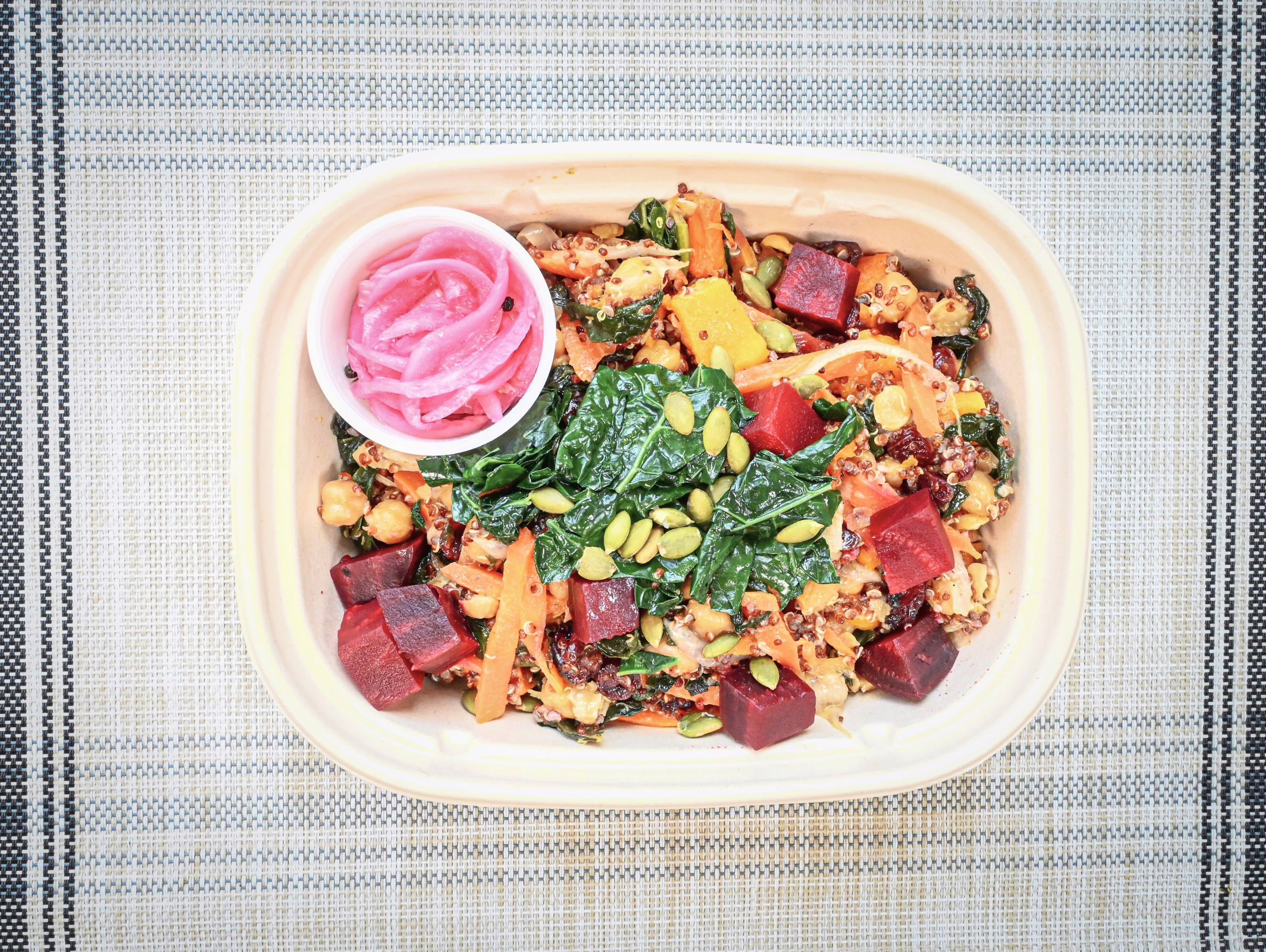 Gingered butternut squash, chickpeas and forbidden black rice bowl with sautéed ginger, garlic, onions, carrots, butternut squash, roasted red beets and lacinato kale in maple ginger sauté. Topped with toasted pepitas and pickled onions (on the side)